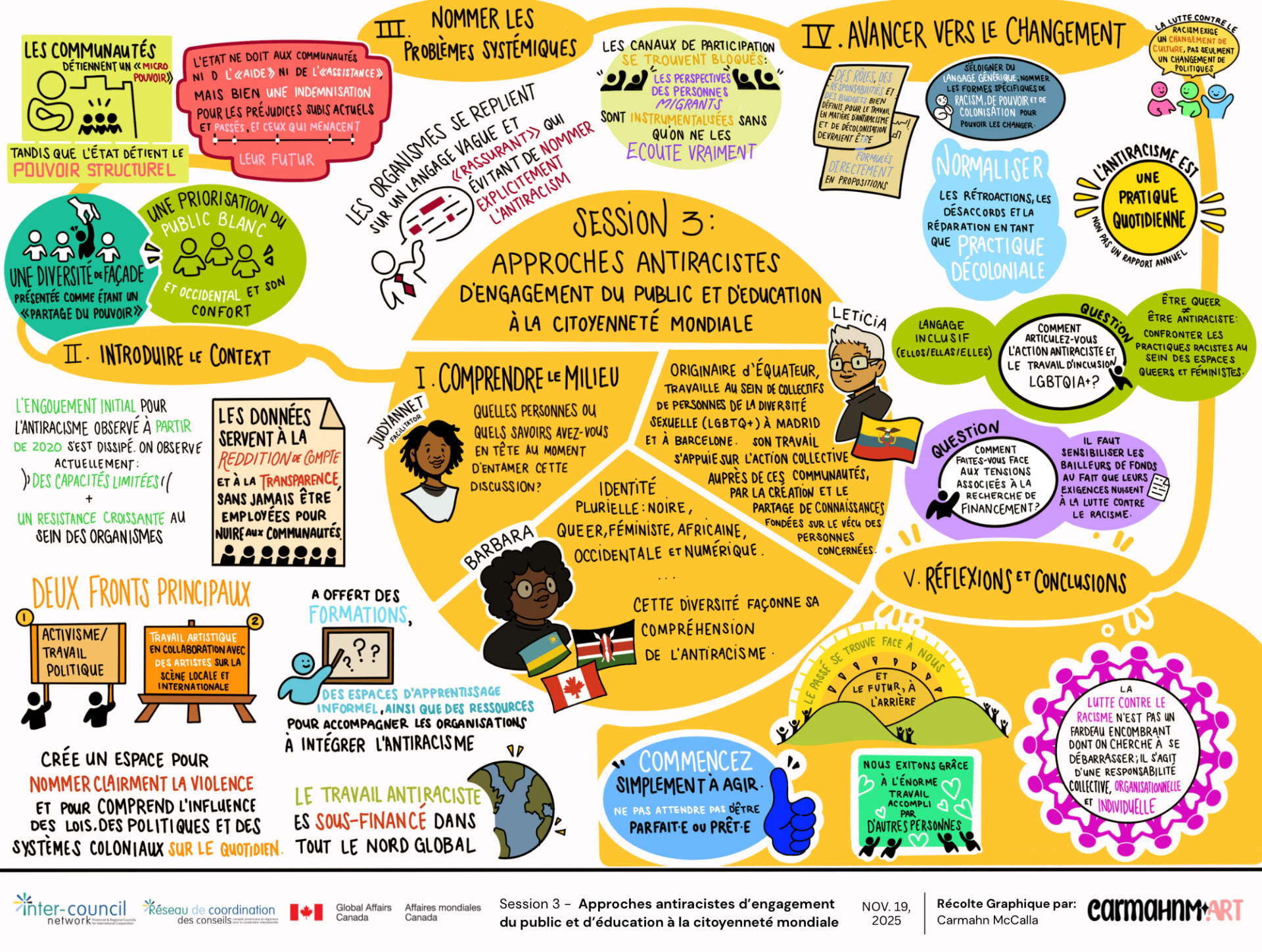 Les approches antiracistes visent à reconnaître et à déconstruire le racisme structurel qui imprègne les institutions et la société. Cet atelier porte sur les moyens qu’ont les organisations de créer des pratiques de mobilisation et d’éducation à la citoyenneté mondiale qui soient plus inclusives, plus équitables et plus justes en traitant ouvertement des inégalités raciales. Les personnes participantes apprendront à reconnaître et à confronter le racisme assumé et ses formes plus subtiles, pour cultiver des environnements où tous les groupes, en particulier les communautés historiquement marginalisées, peuvent participer de façon concrète aux initiatives et aux activités d’éducation à la citoyenneté mondiale et d’engagement du public.