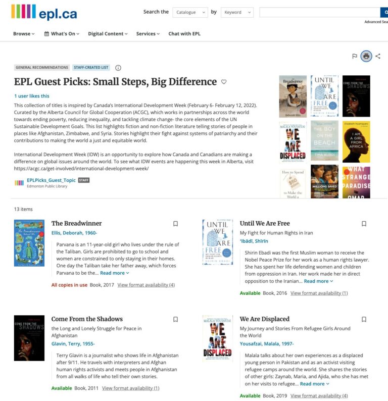 ACGC, in partnership with the Calgary Public Library and Edmonton Public Library, created digital booklists inspired by International Development Week. The collections were in a ‘featured’ area for the week and all books were related to stories of perseverance and hope in the Global South from countries like Afghanistan, Zimbabwe, Syria, to Guatemala.