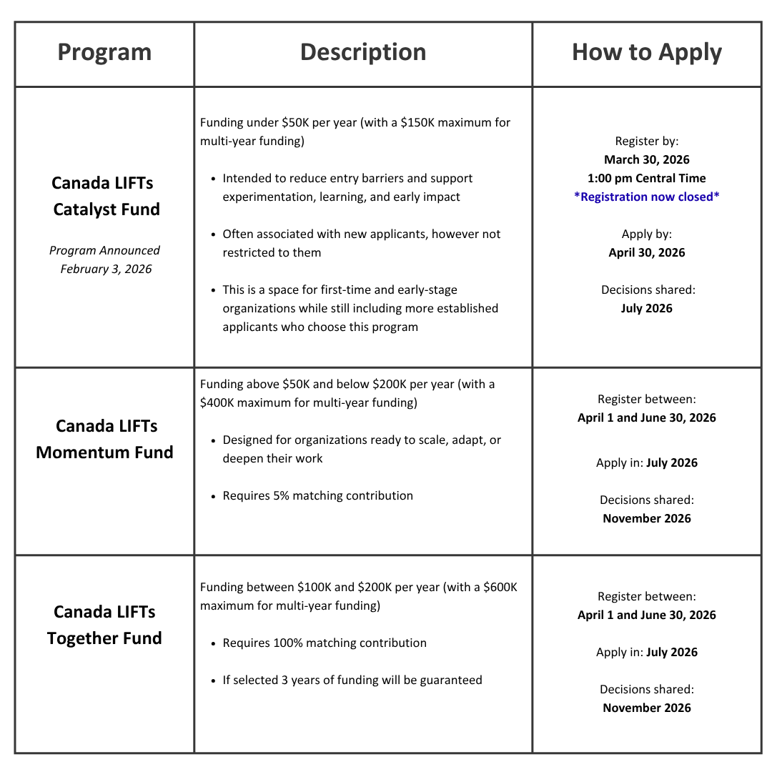 By combining access to funding with practical resources, learning, and peer connection, the explicit intention of Canada LIFTs is to reduce barriers, shift power, and strengthen the broader ecosystem in which SMOs operate.